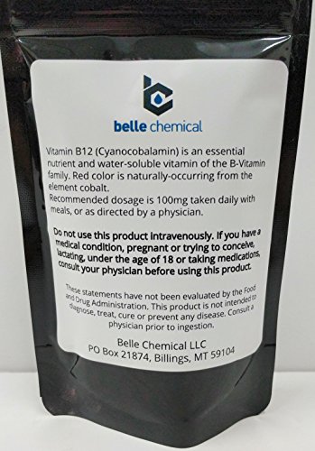 Vitamin B12 (Cyanocobalamin) is an essential nutrient and water-soluble vitamin of the B-Vitamin family. Red color is naturally-occurring from the element cobalt. This product is pharmaceutical grade and may be used in food, diet supplementation or as a pharmaceutical therapy additive/product.Feature