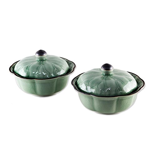 NOVICA Decorative Celadon Ceramic Bowls Set , Green, 11 oz, 'Lotus Leaves' (Pair)