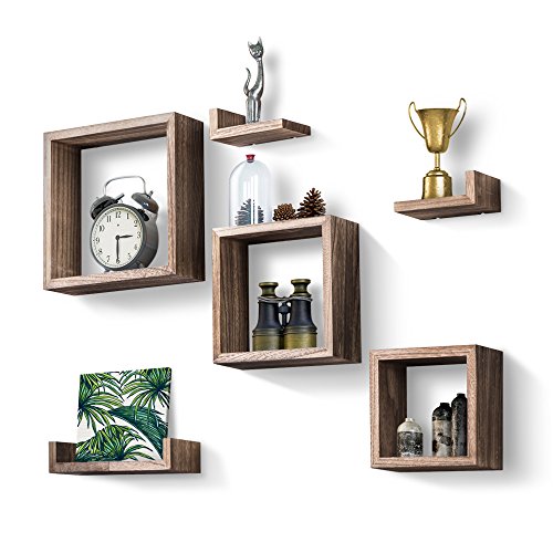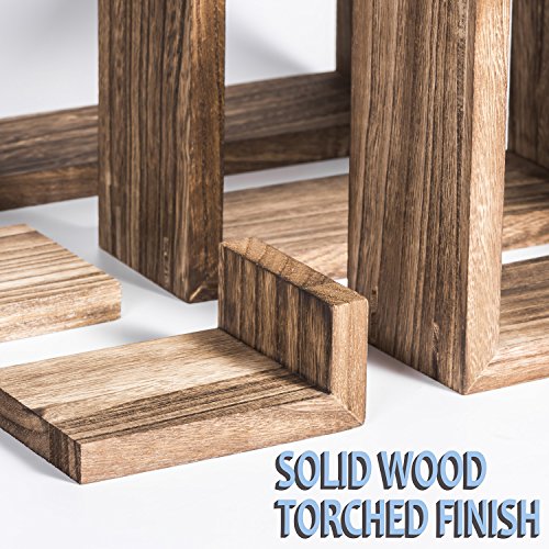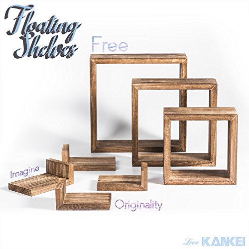 Love-KANKEI Floating Wall Shelves 1. Funtional and simple wood shelves great for home or office organizing and decor! Features 7 wall shelves set of different sizes and shapes to meet diverse needs of displaying collectibles, crafts, house plants and more in living room, bedroom, office, or of organizing home supplies in bathroom or kitchen. The grey floating wall shelves with torched wood finish are great match or additon to any home or office decor!