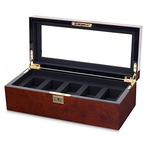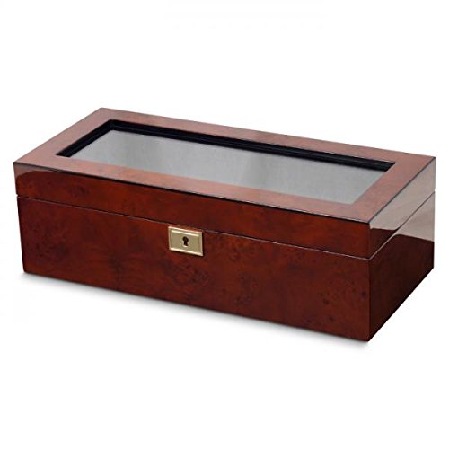 -. Title : Men's Watch Box with Glass Top, 5 Compartments, Key Lock and 2 Color Choices of Wood Veneer Finishes