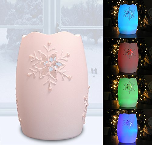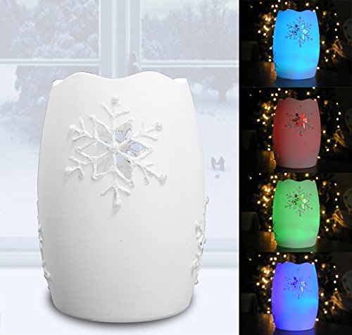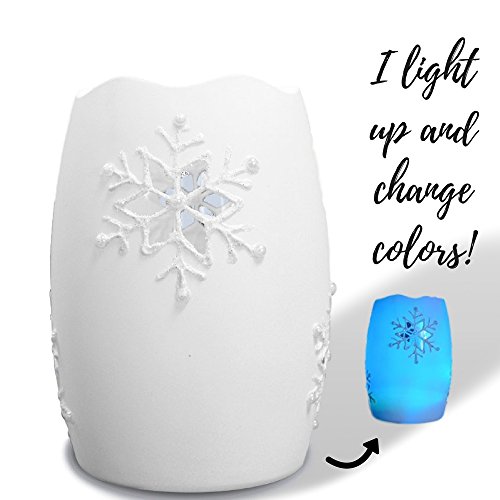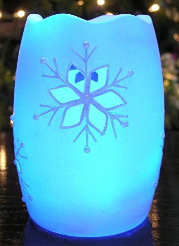 - SNOWFLAKE CANDLE. This beautiful LED lighted sparkly white candles has smooth color changing lights red, blue, green. Each pillar candle has a cutout of a traditional shaped snowflake so when the light is turned on, it shines thru the sides. Perfect addition to your holiday decorations this year.