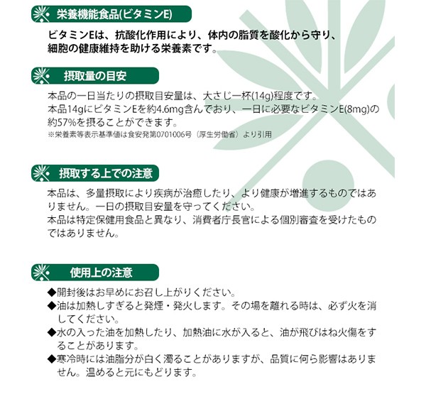| 栄養成分 | 【100gあたり】 エネルギー:900kcal、脂質:100g、たんぱく質・炭水化物・ナトリウム:0、ビタミンE:33mg、コレステロール:0mg、γ-オリザノール:125mg、トコトリエノール:44mg、植物ステロール:697mg |
