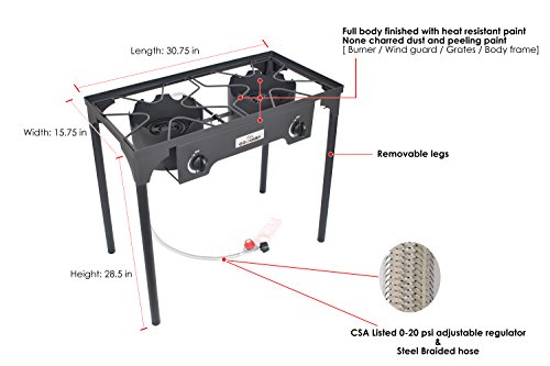POWERFUL: Total output 140,000 BTU. Produced by two 70,000 BTU cast iron burners. Includes CSA Listed 0-20 PSI adjustable regulator and steel-braided hose