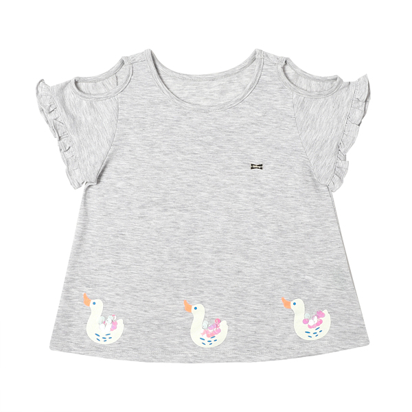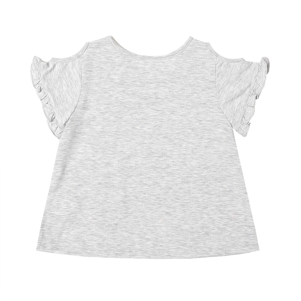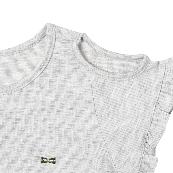 상세설명-부드러운 그레이컬러에 소매를 프릴장식을 하여 여성스러우면서도 귀여운 느낌을 주는 티셔츠입니다.