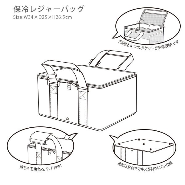 | 仕様 | 機能:保冷保温仕様 開閉:ダブルファスナー仕様 収納量目安:1500mlペットボトル約9本 内側仕様:ふた内側と側面にメッシュポケット付き 底面仕様:5ヶ所足付 持ち手:パッド付、長さ調節可能 |