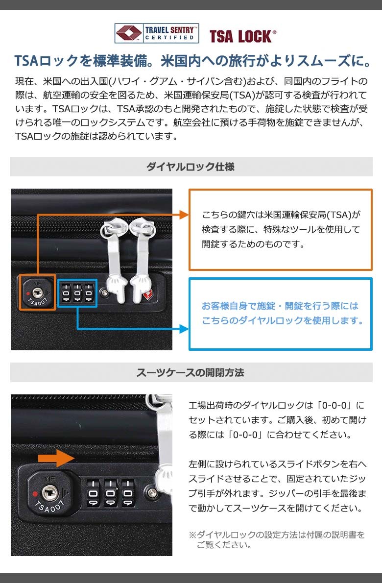 A Mickey Mouse with a classic impression of familiar pose becomes an accent, and it can be used for a wide range of people, the overall finish simple. The pull tab part of the TSA lock has a motif of Mickey Mouse and makes me feel like a Mickey Mouse is closing.