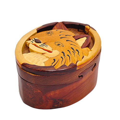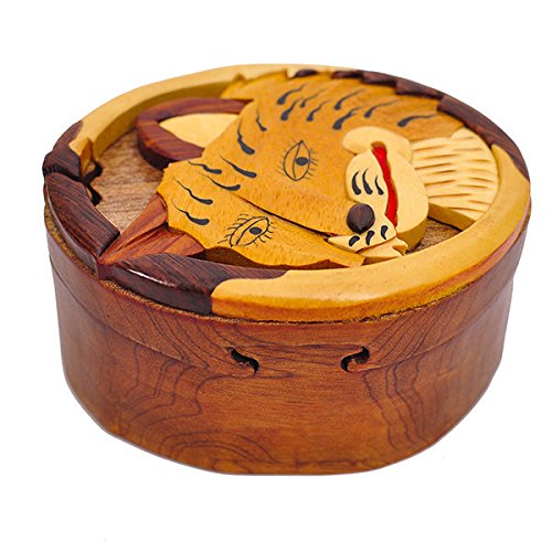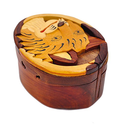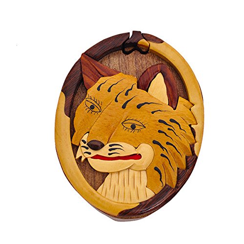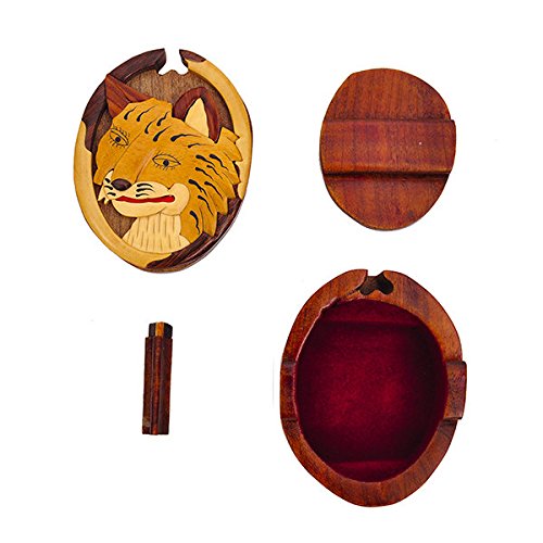 Handmade Wooden Art Intarsia TRICK SECRET Bobcat Head as Puzzle Trinket Box Puzzle Box (3432) (g2)