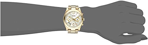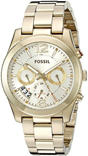 Round watch with champagne dial featuring three subdials, date window, gear-edge bezel, and placed indices
