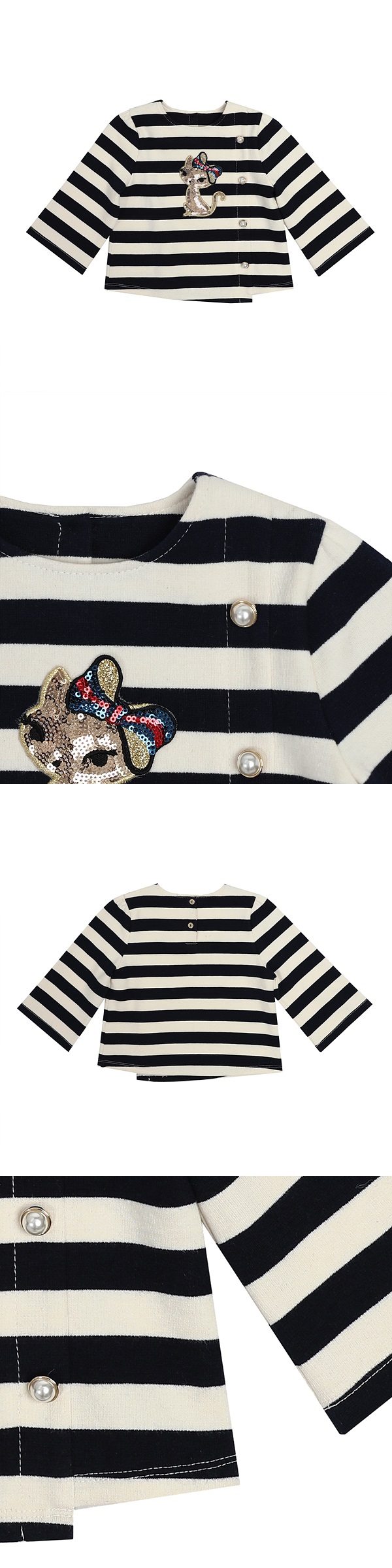 티셔츠 앞부분에 절개되어 장식된 진주단추가 멋스러운 느낌을 주며