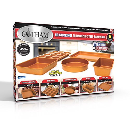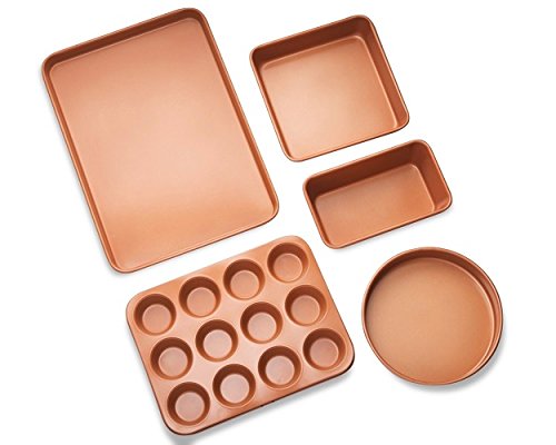 Gotham Steel 5 Piece Copper Bakeware Set with Nonstick Ti-Cerama Coating, Super Strong 0.8MM Gauge, Includes Cookie Sheet, Muffin Pan, Large Baking Pan, Loaf Pan and Round Baking Pan