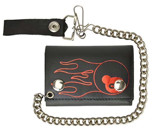 Studio : Marshal Publisher : Marshal Product Description 100% Leather Chain Wallet TriFold Black #946-37 Material: Genuine Leather Tri-fold Size: 3” x 4.25” (Folded)Currency Pocket: YesOther features: Red 8 ball imprint; Snap button enclosure; Chain link attachment 0