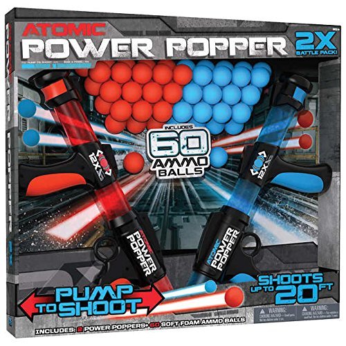 Choose your team and power to victory with the Atomic Power Popper! Each Power Popper fires 12 soft-foam balls in rapid succession-up to 20 feet! The faster you pump the handles, the faster and farther the balls shoot out. 30 foam balls are included for each team, for a total of 60 per set so you can withstand any battle indoors or outdoors.Feature