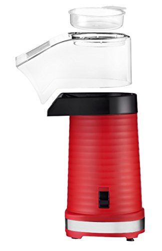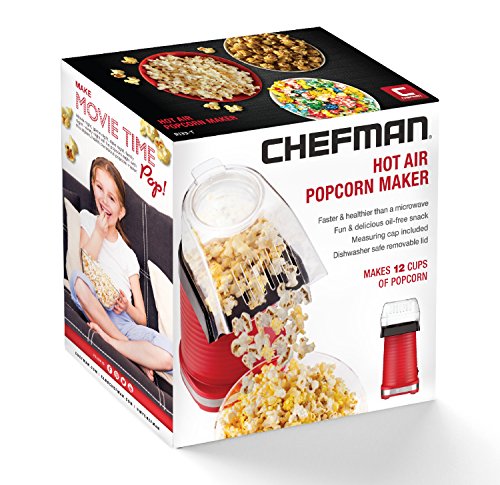 Introducing The Chefman Hot Air Popcorn Maker Movie night, game night, date night, family night - every night will be popcorn night with this stylish, health-conscious popcorn maker. With it's creative and colorful design, this popcorn maker fits perfectly on any counter for any occasion. Benefits Make a healthy, oil-free popcorn with the convenient and easy to use Chefman Hot Air Popcorn Maker. Just put kernels into a popping chamber without any oil added and just in few minutes get up to 12 cups of popcorn right into your bowl. With no additives, homemade popcorn makes a tasty and healthy alternative to a microwave popcorn. Dishwasher-safe parts made for easy clean. Recipe CHOCOLATE-DRIZZLED POPCORN 8 cups popped corn ⅓ cup roasted almonds, unsalted ¾ cup chocolate chips 1 ½ teaspoons shortening (do not use butter, margarine, spread or oil) 1. Add the popcorn and almonds to a large aluminum foil pan. 2. Place chocolate chips and shortening in a small microwave-safe container. 3. Microwave at MEDIUM (50%) 1 minute; stir. If necessary, microwave at MEDIUM an additional 10 seconds at a time, stirring after each heating, until chocolate is melted and smooth when stirred. 4. While hot, use a fork to swirl the chocolate over the popcorn and almonds. 5. Allow cooling at room temperature for 15 minutes. Variations: Use any chocolate or flavored chips of your choice. Combine dark chocolate, milk chocolate, white chocolate drizzles. Create your own special drizzled popcorn. Covered by a 1-year limited warranty, as all the other Chefman products.Feature