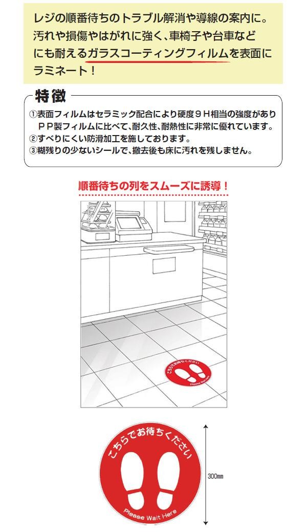| ガラスコーティングフィルムを表面にラミネートした、耐久性抜群のフロア誘導シールです。コンビニ・ドラッグストアなど、屋内の行列のできるあらゆる場所でお使いいただけます。長期に渡って使用感を感じさせず、店舗の美観を保てます(想定期間は通常使用で約2年の目安)。光沢があるタイプなので、視認性にも優れています。 |