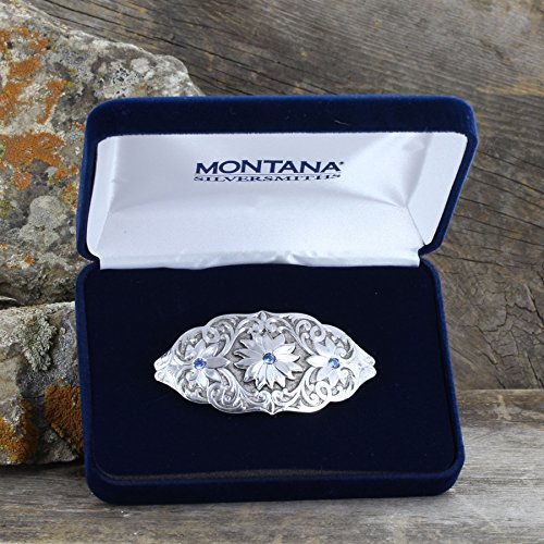 Product Description A scalloped edged antiqued silver finished barrette with three Bitterroot style flowers with a bright blue Swarovski?? Crystal in each center. 0