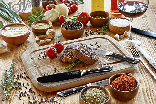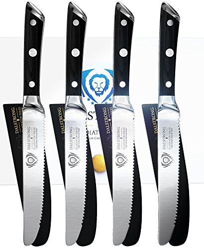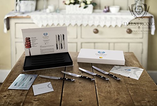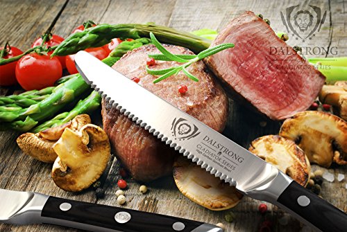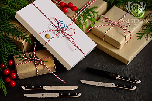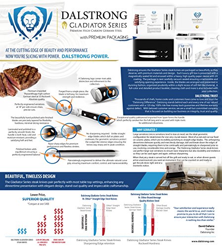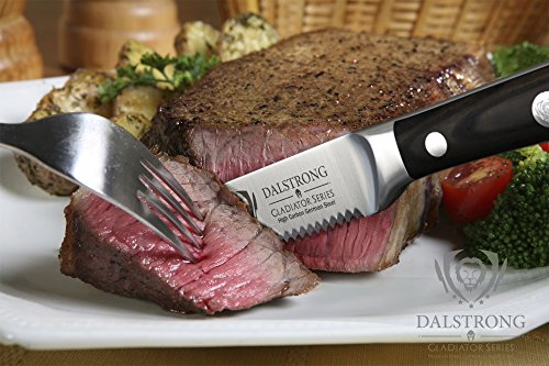 The Dalstrong Difference: In the mealtime arena of our plates, it's the Dalstrong Gladiator Steak knives that stand up to the greatest of culinary challenges. Precision forged from a single piece, the premium quality full-tang, Thyssenkrupp high-carbon German steel syncs with a perfectly engineered serrated edge and sleek, triple-riveted black Pakkawood handle to form the ultimate dinner time instrument. A graceful yet ruthlessly efficient tool that can easily withstand repeated abuse incurred after clashes with hard ceramic plates, unlike straightedge blades. The knives perform like the most heroic of gladiators, with expert maneuverability, confident in their precise slicing and clean strokes.