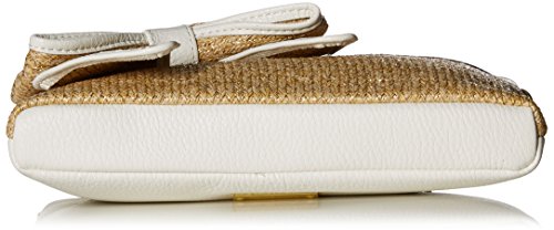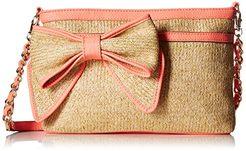 The Scarlett Cross body Clutch is constructed in soft pebble polyvinyl chloride. Features include a front magnetic snap pocket, one back zip pocket, two interior slip pockets and one back zip pocket. Polyester lining, detachable cross body strap with a chain detail, wristlet strap, and front exterior bow embellishment.Feature