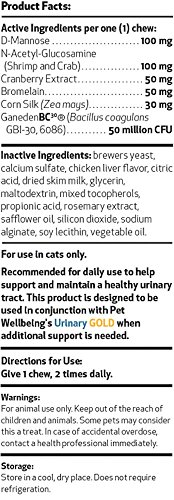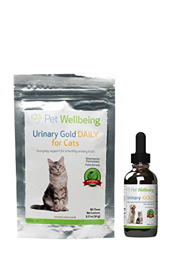 -. Binding : Misc. -. Brand : Pet Wellbeing -. EAN : 0661822000526 -. Feature : Save when you buy both of our outstanding urinary tract support products in one convenient pack. / Urinary Gold (in a convenient liquid) helps to naturally support a healthy urinary tract and normal pH in the bladder. This is a herbal supplement for cats who need bladder support. / Urinary Gold Daily for cats (soft chews) provides the nutrients for ongoing urinary tract health. With strong immunity in this area, opportunistic pathogens cannot take hold. / Selectively chosen ingredients: This formula is entirely prepared from ingredients from trusted sources only. / NSF Certified GMP Facility: Nationally recognized quality control procedures are meticulously monitored. The NSF Certification Program protects consumers by ensuring that the highest standards of manufacturing are strictly adhered to. -. Label : Pet Wellbeing -. Manufacturer : Pet Wellbeing -. MPN : PW 0051C -. PackageQuantity : 1 -. PartNumber : PW 0051C -. ProductGroup : Pet Products -. ProductTypeName : PET_SUPPLIES -. Publisher : Pet Wellbeing -. Studio : Pet Wellbeing -. Title : Pet Wellbeing - Urinary Gold and Urinary Gold Daily for Cats - Urinary Tract Health For Cats - 60 chews plus 2oz(59ml) Bottle -. UPC : 661822000526
