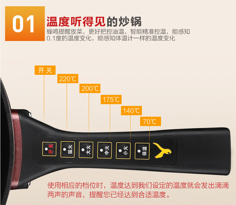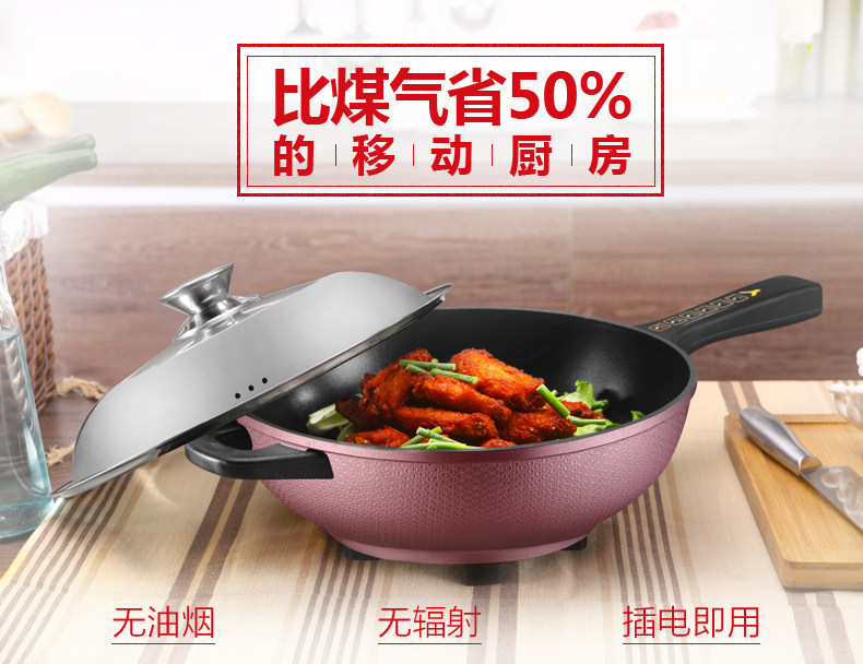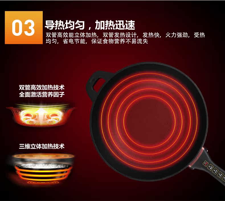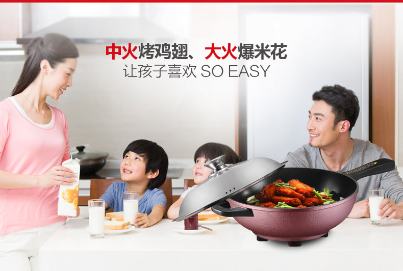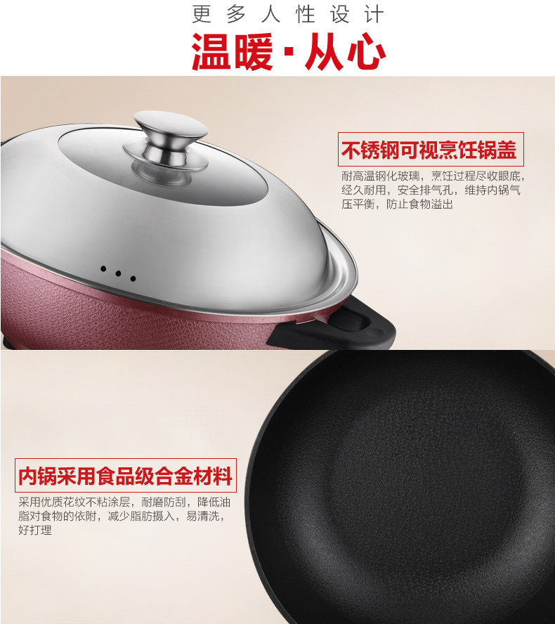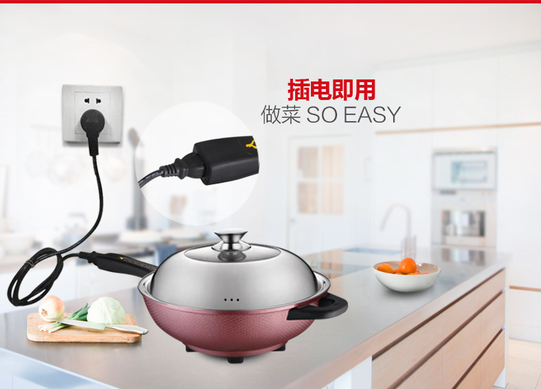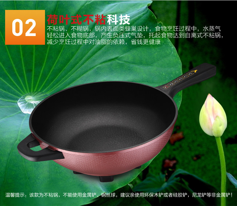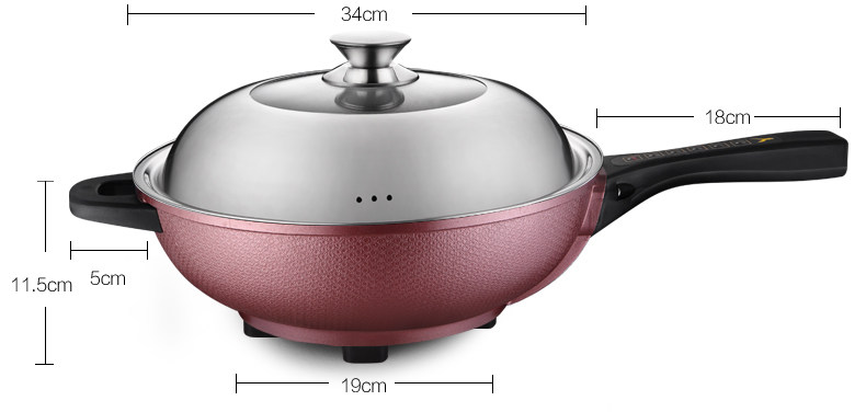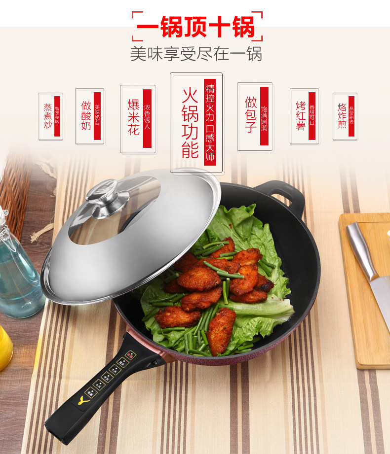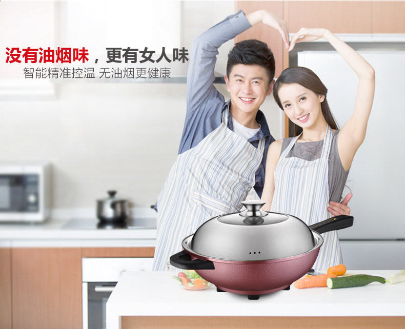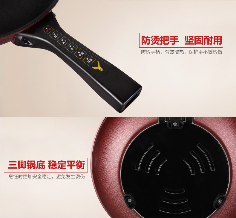 本款电炒锅有智能控温功能,当某个档位温度超过系统设定温度时,电炒锅会自动断电,不会因为温度过高产生致癌物质,同时保护电炒锅,当温度下降到额定温度时,电炒锅会自动重新开始加热。