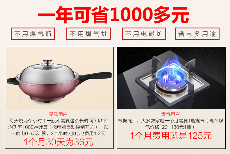 以1600瓦的锅举例,我们的锅连续工作一个小时,才1.6度电,一天三餐大概也就是2-3度电,易欣的员工都在用这个锅,一个月大概30多的电费。为了我们孩子的明天,节能环保,减少排放,也减少雾霾,从你我做起!