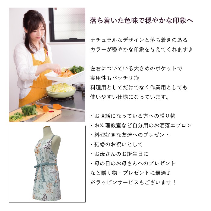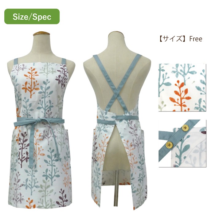 落ち着いた色合いとナチュラルなデザインが、 穏やかな気持ちにさせてくれるおしゃれで可愛いエプロンです。 ■サイズ フリー 着丈(胸元のレースから裾まで) : 約71cm  ウエスト : 約84cm 腰紐(片側): 約90cm ■材 質 綿100%