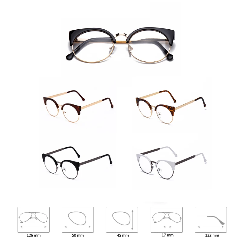 Model Number: F15010 Frame Feature: Round cat eye metal half frame Hinges: Reinforced Metal Hinges