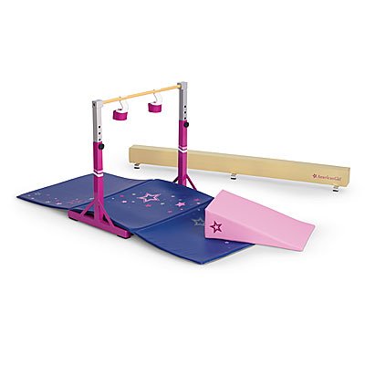 -. Feature : Her American Girl® doll can practice gymnastics routines with this sporty set, including: A floor beam covered in vinyl to help her "stick" landings A practice bar that looks just like the real thing Grips to help her hold onto the bar, so she can really do flips A starry gym mat to keep her safe A pink foam block to help her build the confidence to learn a new move