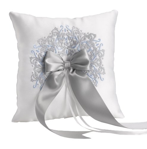 • Adorned with silver and sky blue embroidered design, silver bow and white ribbons to tie rings in place