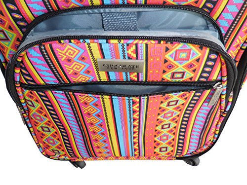 -. Brand : Chocolate New York -. Department : womens -. Feature : Smart, casual, 18" Spinner Carry-on in bright colors / Large main compartment for clothing with 2 interior zip pockets / 2 outside zip pockets, one with2 internal zip pockets / 2 side zip pockets, both large enough for water bottles / Extendable pull handle -. Model : 753 -. PackageQuantity : 2 -. ProductGroup : Apparel -. ProductTypeName : LAGE -. Size : Medium -. Title : Bundled - Chocolate New York, 4 wheel Spinner Carry-on with Allant Slim Tote