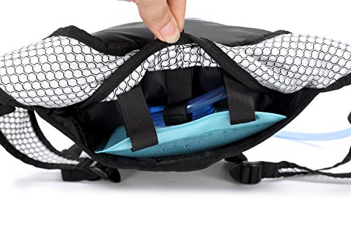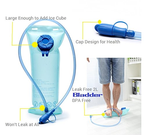 -. Feature : 1.PERFECT SET - Include 2L FDA APPROVED food grade hydration bladder / 2.SUPER LIGHT - Weight 0.77 lb with 2L bladder in high quality of the workmanship & Nylon material, it definitely won't burden you when sporting / 3.GOOD VOLUME - Pack Size:18 * 11.5* 0.8 inch, includes 2 storage compartments (16.5 * 9.85 inch) that will fit your clothes, keys, purses, phones etc. For even more storage, the front stretch mesh pocket allows you to pack more when out / 4.MULTIPLE USAGE BLADDER - It can bear the weight of 132 lb, you can use it as pillow if need to rest lying down outside, the opening is large enough to add ice cubes for chilling / 5.WON'T LEAK - As long as the screw between the bladder and the straw well tightened, it won't leak at all