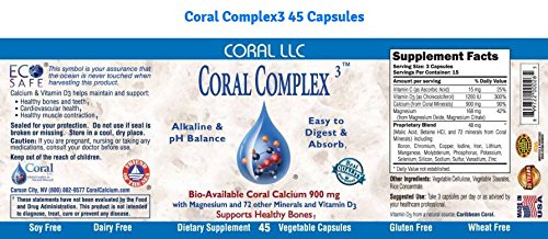 Coral Complex in vegetable capsules, now with 900mg of Bio-Available Coral Calcium per serving along with 1200 IU's of Vitamin D3. The original encapsulated coral calcium formula and purest. Coral Complex was the original (1999) powdered coral capsule in the USA. The formula has become the most popular and successful coral capsule formula in the world. The most notable additive is 400 IU of vitamin D3 as cholecalceriferol in each capsule. Vitamin D3, the sunshine vitamin, is necessary to charge the receptors in the small intestine that are instrumental in the uptake of calcium. Coral Complex also delivers more than 70 trace mineral which are also essential to the body functions. As always all our Coral Calcium is ECO SAFE to assure the consumer that the ocean is never touched when harvesting this product.