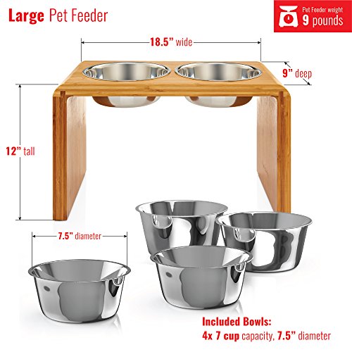 Mealtime Doesn't Have to Mean Big Messes Anymore Silicone rings hold the two stainless steel bowls securely in place, preventing them from being nudged, tipped over or moved around. Water stays inside the dish, rather than spilling over and leaking onto the floor. Raised Bowls Equal Improved Digestion Older, aging dogs and dogs who suffer from a variety of problems, such as arthritis and back or hip injuries can find it painful to strain their necks in order to eat from the ground. In addition to aiding better digestion, these bowls and their elevated stand promote a healthier way for your pets to enjoy their meals. Always Have a Fresh, Clean Bowl Ready The only thing better than two strong stainless steel bowls is four stainless steel bowls. Always be prepared with a fresh, clean bowl for your pet. It's so much better than forcing them to eat from bowls caked with old food and dirt. Saves Your Beautiful Floors Repeated spills can stain and warp your expensive wood floors and can cause slipping hazards for the rest of the family. With these bowls, you'll ensure your pet's food and water stays happily in the bowls where they belong. Order Your New Large Elevated Dog Pet Feeder Today and Ensure Your Dog's Meals are Better Than Ever 0 |