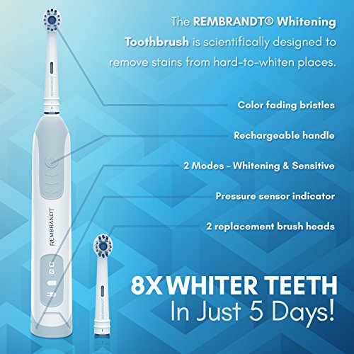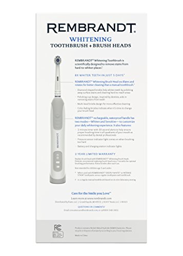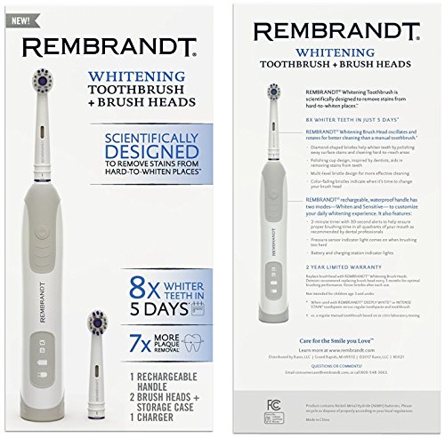 ReleaseDate : 2017-09-02 Studio : Ranir Publisher : Ranir Binding : Health and Beauty Product Description The Rembrandt Rechargeable Oscillating Whitening Toothbrush is scientifically designed to remove stains from hard-to-whiten places. Our rechargeable power toothbrush provides 30x more stain removal from visible spaces between teeth. You will notice your teeth will be 8x whiter from using this electric toothbrush in 5 days or less. The Rembrandt Oscillating Whitening Toothbrush also provides 7x more plaque removal! 0