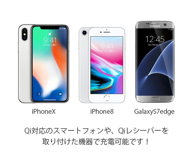 | Qi対応デバイス ※iPhoneの場合、iPhoneX / 8 / 8 Plus以外の商品は対応しません (iPhone X、iPhone 8, 8 Plus、Galaxy Note8、Galaxy S8, S8+, S7、S7 Edge、S6、S6 Edge、Nexus5、6など) | |