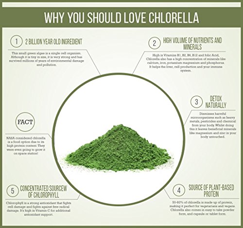 -. Feature : ❤️ NATURE'S ULTIMATE DETOX SUPPLEMENT: Chlorella is believed to help 'detox' the body, and to increase the number of good bacteria in the body. It is also believed to help with energy levels. HIGH IN BETA CAROTENE AND CHLOROPHYLL - two of nature's most powerful 'plant foods' that may / ❤️ Our chlorella is the broken cell wall variety which increases the nutrients available for absorption / ❤️ Contribute to some of the health effects of plant-foods. / ❤️ Contributes to immune system support, reduction of tiredness & blood sugar support / ❤️ HIGH IN PROTEIN - a great source of plant-based protein - get your protein WITHOUT eating animal foods! Chlorella also contains a lot of Vitamin A, B2, Iron, and Zinc