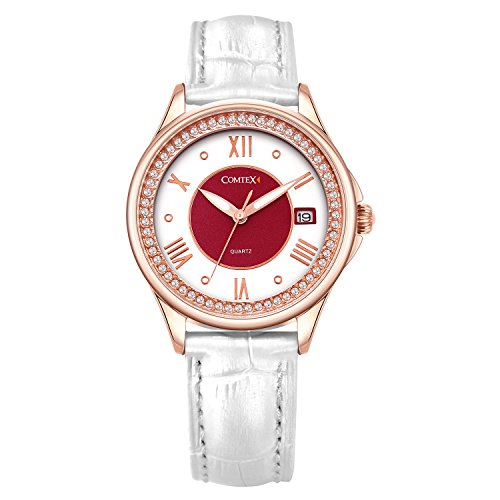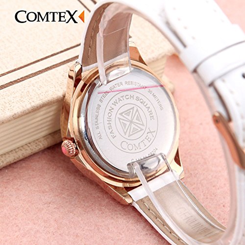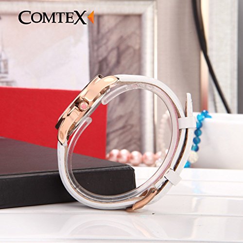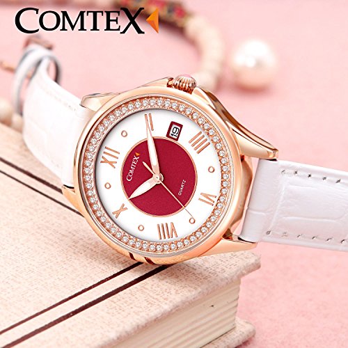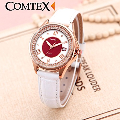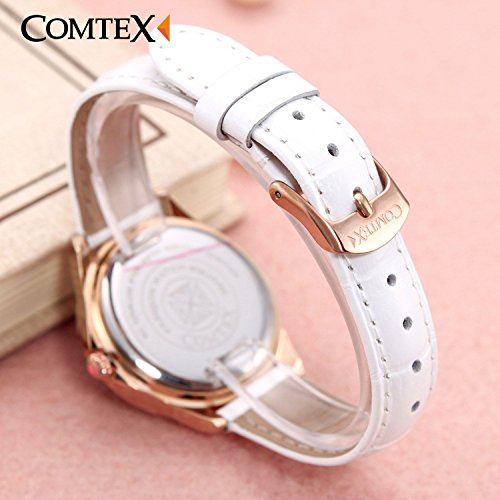 Comtex 손목시계 화이트 캘린더 부착 아날로그 워치 레더 벨트 시계 레이디스