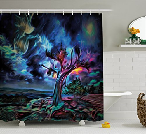 Night Sky Shower Curtain by Ambesonne, Desert Old Tree Hand Paint Like Image Cosmos Nebula Outer Space Themed Image, Fabric Bathroom Decor Set with Hooks, 70 Inches, Multicolor