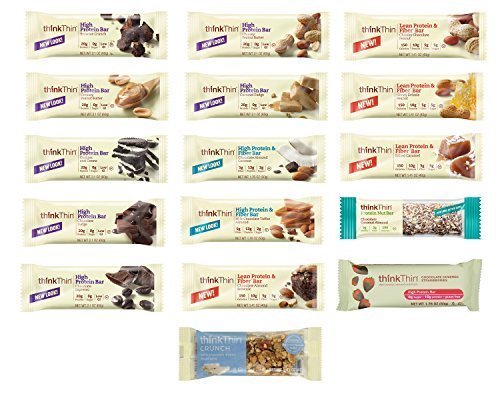 -. Feature : Try one bar each of 16 delicious flavors with this thinkThin Variety Pack / High Protein Bar (2.1 oz) Flavors Incude: Brownie Crunch, Creamy Peanut Butter, Cookies & Creme, Chocolate Fudge, Chocolate Espresso, Chocolate Covered Strawberries, Chunky Peanut Butter, and Caramel Fudge / High Protein & Fiber Bar (1.76 oz) Flavor Incudes: Chocolate Almond Coconut and Milk Chocolate Toffee Almond / Lean Protein Fiber, Protein Nut and Crunch Mixed Nuts Snack Bar (1.41 oz) Flavors Include: Chocolate Almond Brownie, Chunky Chocolate Peanut, Honey Drizzle Peanut, Salted Caramel, Coconut Chocolate Mixed Nuts, and White Chocolate Dipped / Gluten Free, Kosher, Natural Ingredients are extracted directly from plants
