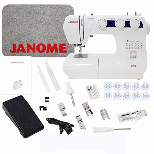 -. Binding : Office Product -. Brand : Janome -. EAN : 0708038732282 -. Feature : Bonus Bundle Includes: Janome Muffling Mat, 6 Bobbins / The Janome 2222 is a quality entry level model offered at a fantastic P.R.Ice! / This mechanical machine features 22 built-in stitches and a four-step buttonhole. Dial pattern selection and stitch width and length adjustment ensures ease of use. / Great features like a free arm and drop feed make it versatile for all types of sewing. / Lightweight and easy to use, this is the perfect machine for a beginner and the P.R.Ice is just right! -. Label : Janome -. Manufacturer : Janome -. Model : SVD2222BONUSBUNDLE -. PackageQuantity : 8 -. ProductGroup : Art and Craft Supply -. ProductTypeName : ART_SUPPLIES -. Publisher : Janome -. Studio : Janome -. Title : Janome 2222 Sewing Machine with Bonus Bundle -. UPC : 708038732282