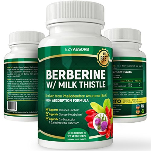 -. Feature : KEY HEALTH BENEFITS: Each of EzyAbsorb's non-GMO Berberine capsules provides 500mg dose; Berberine contains anti-inflammatory and antioxidant properties, supports healthy blood sugar levels, improves immune health and aids in weight loss and promotes cardiovascular health. / IMPROVED BERBERINE FORMULA: Our capsules feature Berberine Hydrochloride w/ milk thistle (natural herb), this enhanced form is widely studied and considered to be absorbed more easily by the body into the bloodstream. / OPTIMAL 500MG DOSE: The recommended daily Berberine dosage is around 1500mg. Many studies have shown you should take Berberine 500mg, three times daily, to reach the correct recommended dosage. Using separate doses improves absorption but more importantly helps you avoid side effects like stomach cramps and nausea that arise from a concentrated 1500mg dose. / NO ARTIFICIAL EXCIPIENTS (SYNTHETICS): Our Berberine HCL 500 mg capsules is free of magnesium stearate, stearic acid, dicalcium phosphate and silicon dioxide. EzyAbsorb Berberine supplement is a great choice for people who want a truly natural and organic supplement at an affordable P.R.Ice. / MADE IN THE USA: EzyAbsorb Berberine dietary supplement is proudly manufactured in the USA in an FDA registered facility that adheres to Good Manufacturing Practices (GMP). This product is 3rd-party tested to ensure the highest quality and purity. We do not compromise on quality.