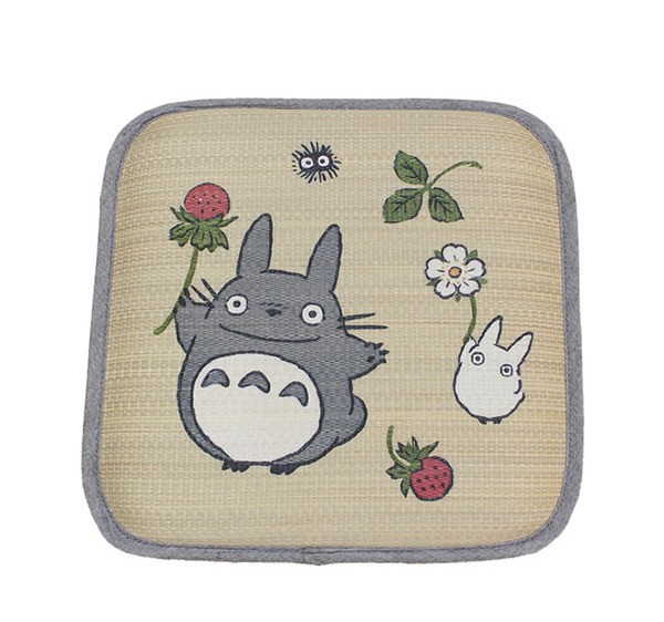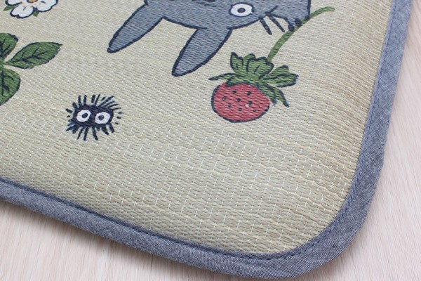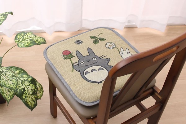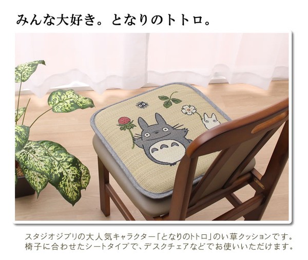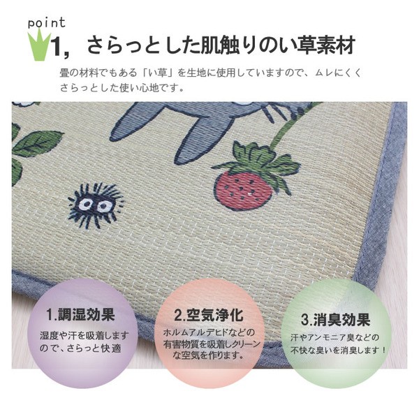 かわいいトトロをあしらったイ草のシートクッションです。側地には国産(九州産)のイ草を使用しています。国産イ草は一本一本が太く、表皮が厚く繊維がキメ細かいので弾力性があり、耐久性に優れています。その他イ草の効能として1.綿の約2.5倍の吸湿力 2.汗のにおいを軽減。汗のにおいの元となる化学物質を90%以上抑えます。などがあります。中材にはウレタン30mmを使用しています。適度なクッション性ありますのでフローリングでのご使用にも適しています。い草の表面に天然青森ヒバ加工を施しています(抗菌・防臭効果)。青森県のヒバの木から抽出した「ヒバ油」をメーカー独自の技術で材料や商品に加工しました。「ヒバ油」には、ヒノキチオールという天然物質としては極めて抗菌性の高い成分が含まれ、医療や食品など多分野で利用研究が進められています。※自然素材であること、また職人が一つ一つ手作業にて加工を行うため、形状のバラつきや表示サイズと多少異なることあります。ご了承下さい。