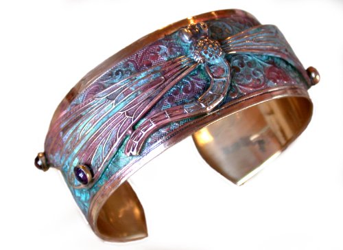 A Decorative Dragonfly Cuff in our one of a kind coloration Verdigris Patina Solid Brass with genuine Amethyst and Garnet cabochons.