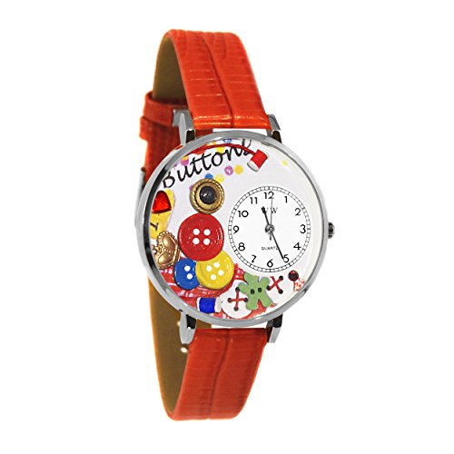 Amazon.com If you have someone who collects buttons in your life, then the Whimsical Watches Unisex I Love Buttons Red Leather Watch #U0410011 is just what you're looking for. This fun and fanciful timepiece features a colorful "I Love Buttons"-themed scene alongside a circular white time display with gold-tone hands and Arabic numerals. Precise, high-quality Japanese quartz movement ensures time-keeping reliability, while the red leather band offers a secure, comfortable fit. A stainless steel bezel surrounds the 42-millimeter case and rounds out the details. This whimsical watch is water resistant to 100 feet (30 meters). 0