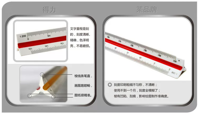 得力(DeLi)30cm三棱比例尺与某品牌细节对比产品包装说明