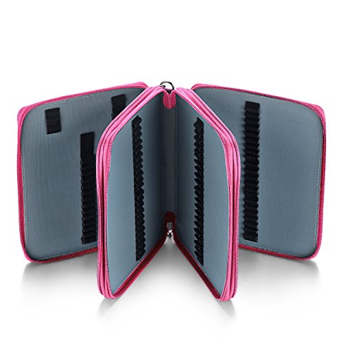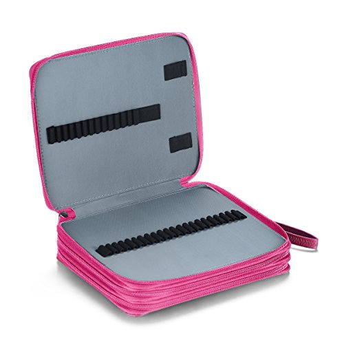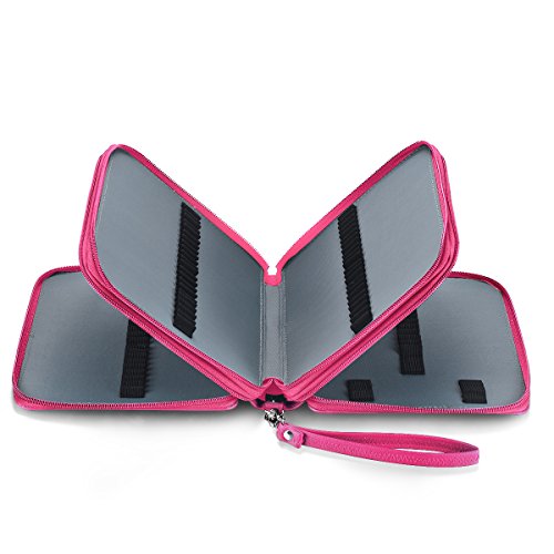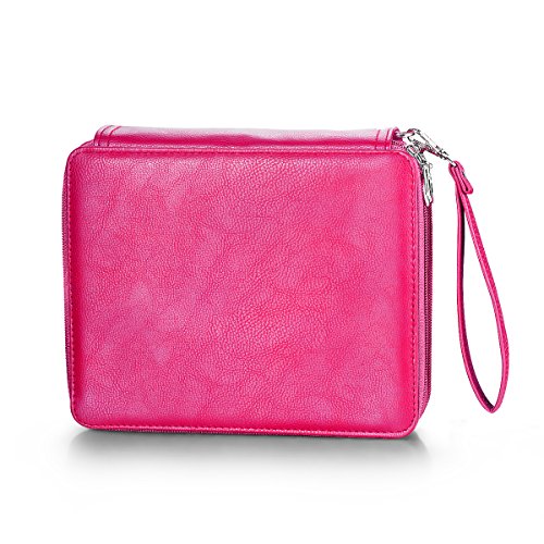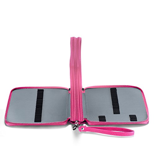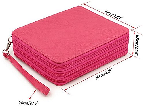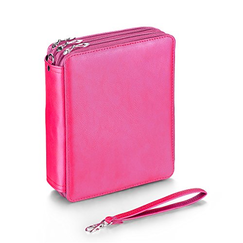 Colored Pencil Case Bag Organizer Box Pouch, 120 Slots, 3 Layer Zipper, Eraser Ruler Pencil Holder, PU Leather case with Handle Strap, Hot Pink