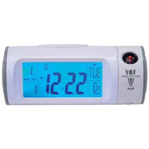 Features 12/24hr digital clock, day of week, date, temperature, blue backlight display, alarm with snooze function, time projection, projection focus adjustment, and choice of Fahrenheit or Celsius. Requires 3 AAA batteries (not included). Measures 6-5/8" x 2-3/4" x 3-1/2". Gift boxed.