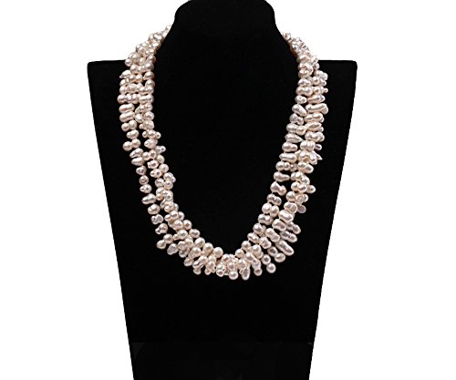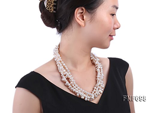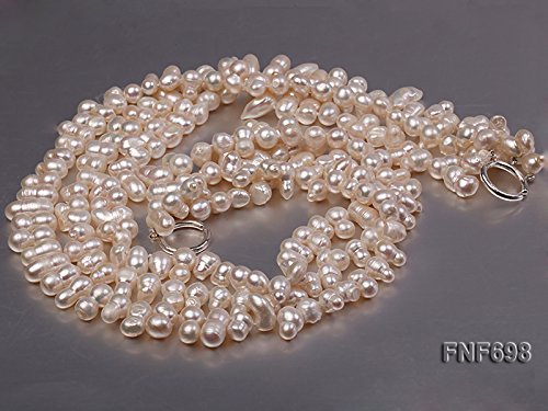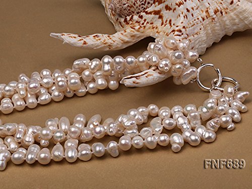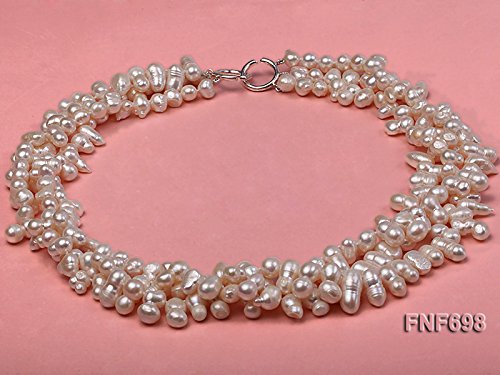 Description *This is a beautiful three-strand necklace set with 8-9mm white side-drilled gourd-shaped freshwater pearls. The necklace is ended with a sterling silver clasp.