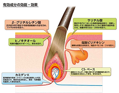 -. Feature : This is the Scalp care lotion that prevents hair loss and itching of the scalp, and keeping the comfort of the scalp. / Hair growth-promoting components make your hair grow more and more beautiful. / How to use:You apply to the scalp the some liquid and massage well. / Amount:150ml Raw materials and components:Pyridoxine hydrochloride, salicylic acid, β- glycyrrhetinic acid, hinokitiol, Kamigen K, water "other ingredients" CS- base, anhydrous ethanol, dicaprylate propylene glycol, propylene glycol, fragrance / Please do not use when you experience any trouble with the scalp.