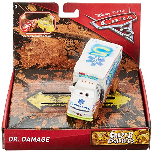 -. Binding : Toy -. Brand : Disney -. EAN : 0887961407228 -. Feature : New, larger scale Crazy 8 Crashers vehicles inspired by Disney/Pixar Cars 3 / Rev them against a surface and release, they race and collide into obstacles and competitors! / The Full collection includes more favorite personality vehicles! Each sold separately, subject to availability / Perfect addition or beginning to any Disney/Pixar Cars collection! / Great gift for any Disney/Pixar Cars fan -. IsAdultProduct : 0 -. Label : Mattel -. Manufacturer : Mattel -. Model : DYB22 -. MPN : DYB22 -. PackageQuantity : 1 -. PartNumber : DYB22 -. ProductGroup : Toy -. ProductTypeName : TOYS_AND_GAMES -. Publisher : Mattel -. Studio : Mattel -. Title : Disney Pixar Cars 3 Crazy 8 Crashers Dr. Damage Vehicle -. UPC : 887961407228 -. Warranty : 1 year warranty against manufacturer defects