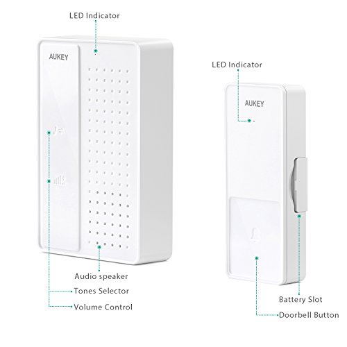 Don't miss a visitor or delivery again. Hear your doorbell loud and clear from the living room, garage, or bathroom. The AUKEY Wireless Doorbell has a wireless range of over 1100 feet. Choose from over 36 different tones and adjust the volume to your preference. And yes, it's unbelievably easy to install.